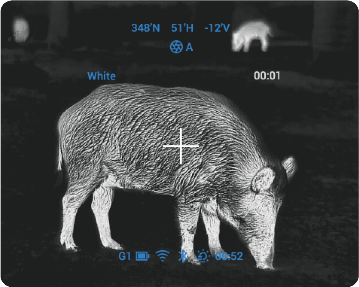 Multiple thermal palettes are available to highlight the target, including 10 color palettes such as White Hot, Black Hot, Iron Red, Tint, Sepia, Cold Green, etc.